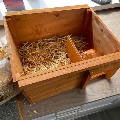 By the end of the day, I had ordered a hedgehog house online. It wouldn’t arrive for a week, so I also turned a cardboard box into a temporary house (lovingly called The Hedgie Hotel) and even picked up some straw from the local petshop to make it feel cozier. I didn’t know if it would actually move into the hotel or the future house, but apparently I was willing to spend £35 to give it the option. Just 3 days after Tall Man had first seen it, I had invested in this hedgehog’s future—and, given it a name.