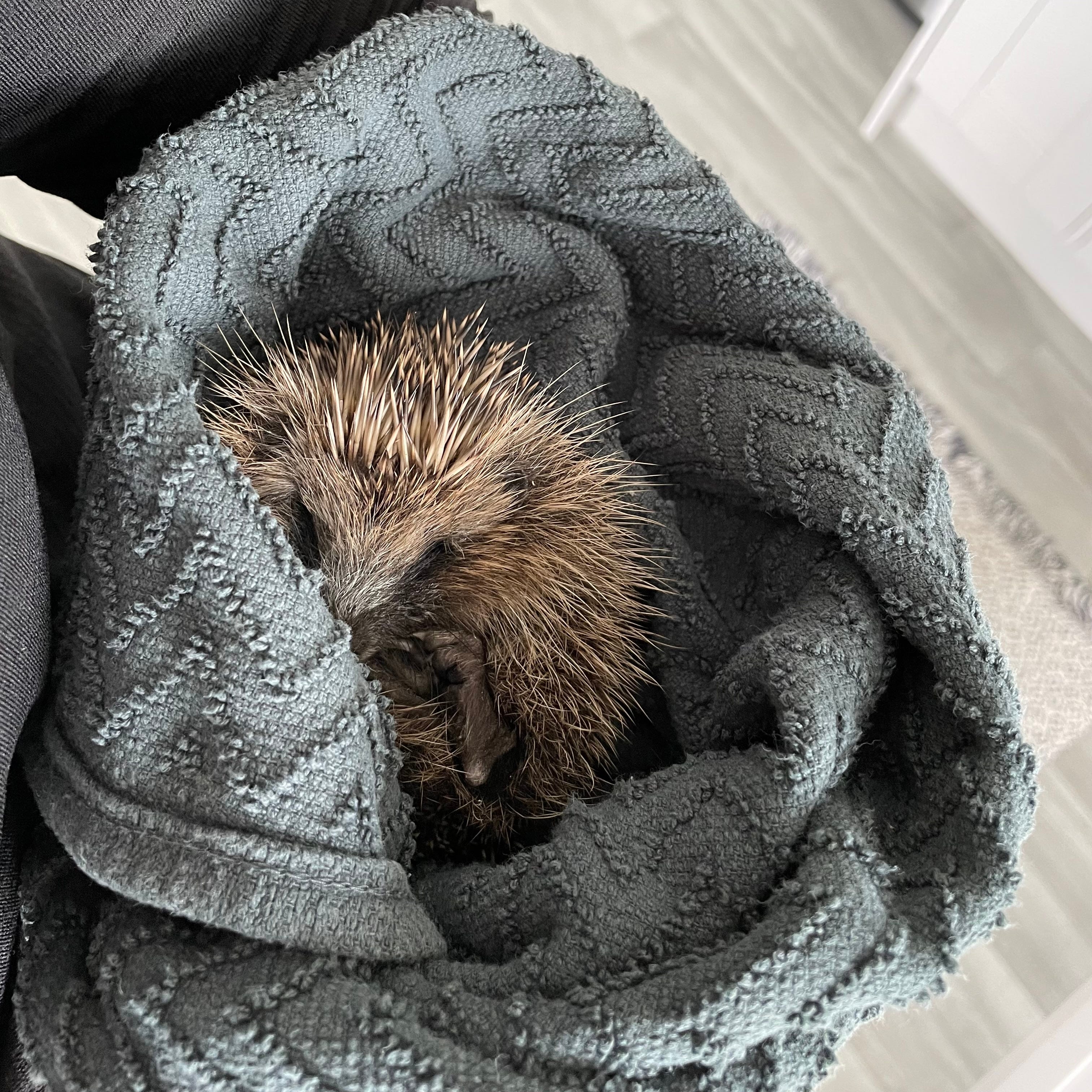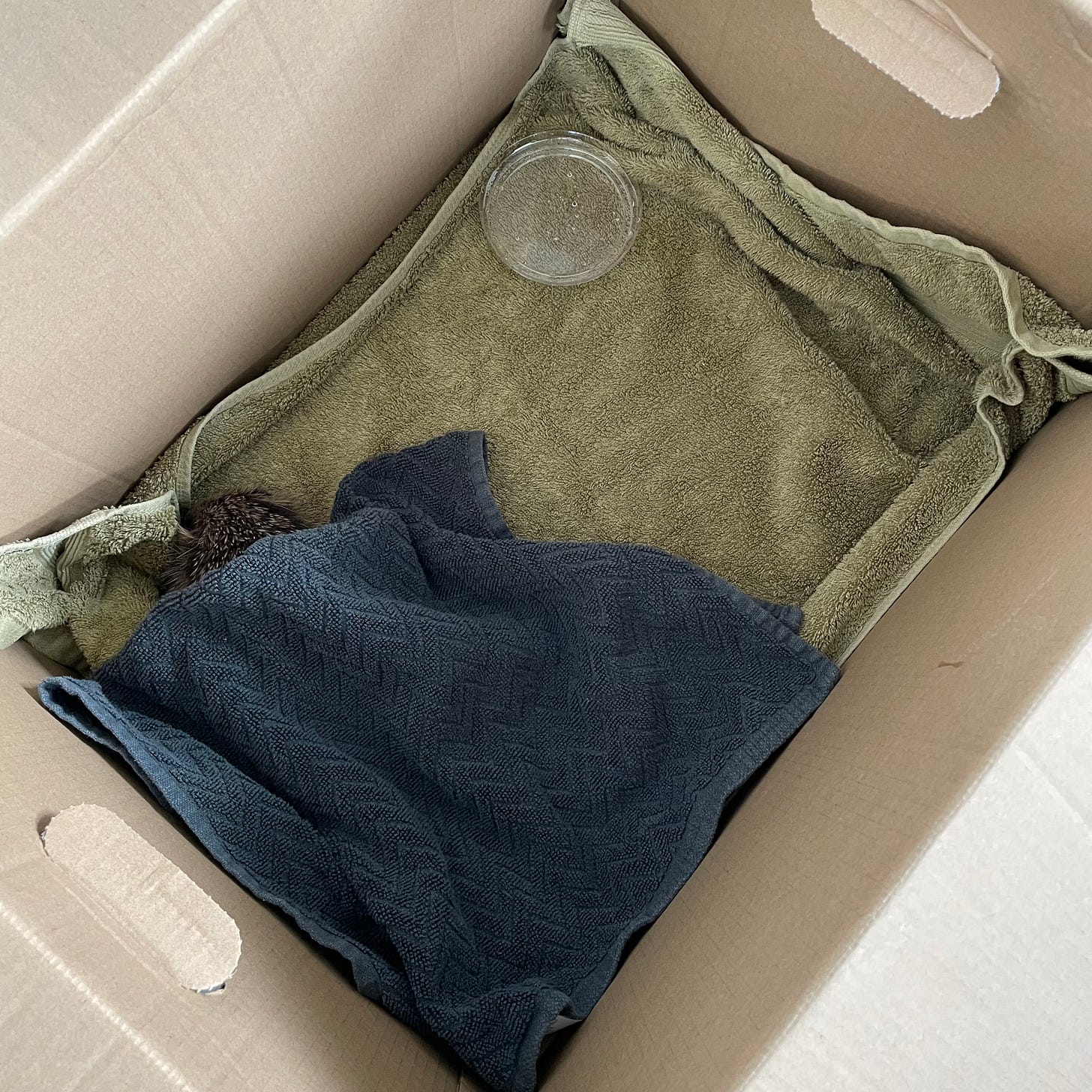 Following the steps outlined on the infographic, I gathered a box and some towels, picked up the hedgehog, and brought it inside. Then I called the British Hedgehog Preservation Society (because of course that’s a thing) and was connected with a man (Terrance) who runs the local hedgehog rescue. He asked me a few questions and sounded hopeful that this little hedgehog would be fine. “It probably just needs some water, and maybe a little (cat or dog) food. If it eats or drinks, you can let it go back outside.”