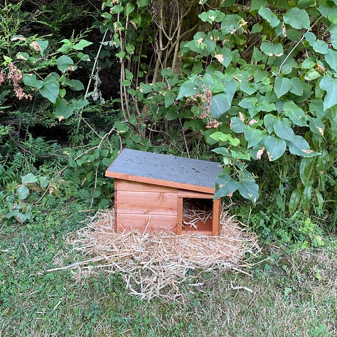 “You can even make one out of cardboard. Just make sure it’s small enough that badgers and foxes can’t squeeze in. Add a little straw or hay. And put some plastic overtop, so it doesn’t get soaked in the rain. Your space is perfect for them. If you’re open to having them around, they’ll live anywhere that feels safe.”